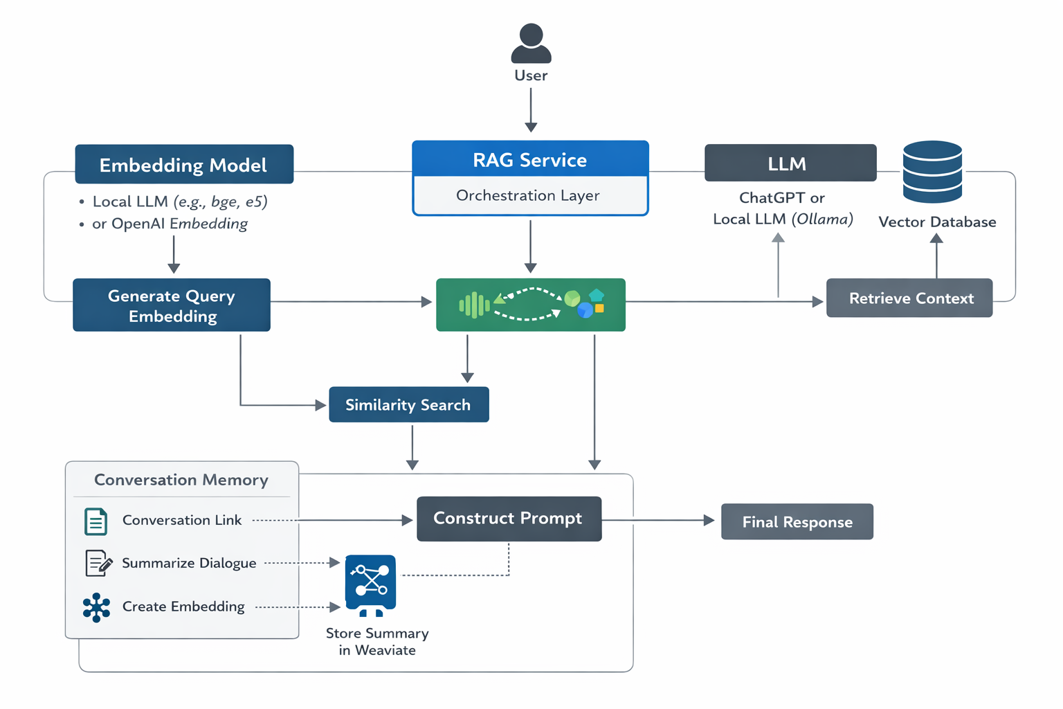 ContextRAG sits between developers and Large Language Models. It retrieves relevant project knowledge and augments prompts so AI systems can generate responses grounded in real project context.
